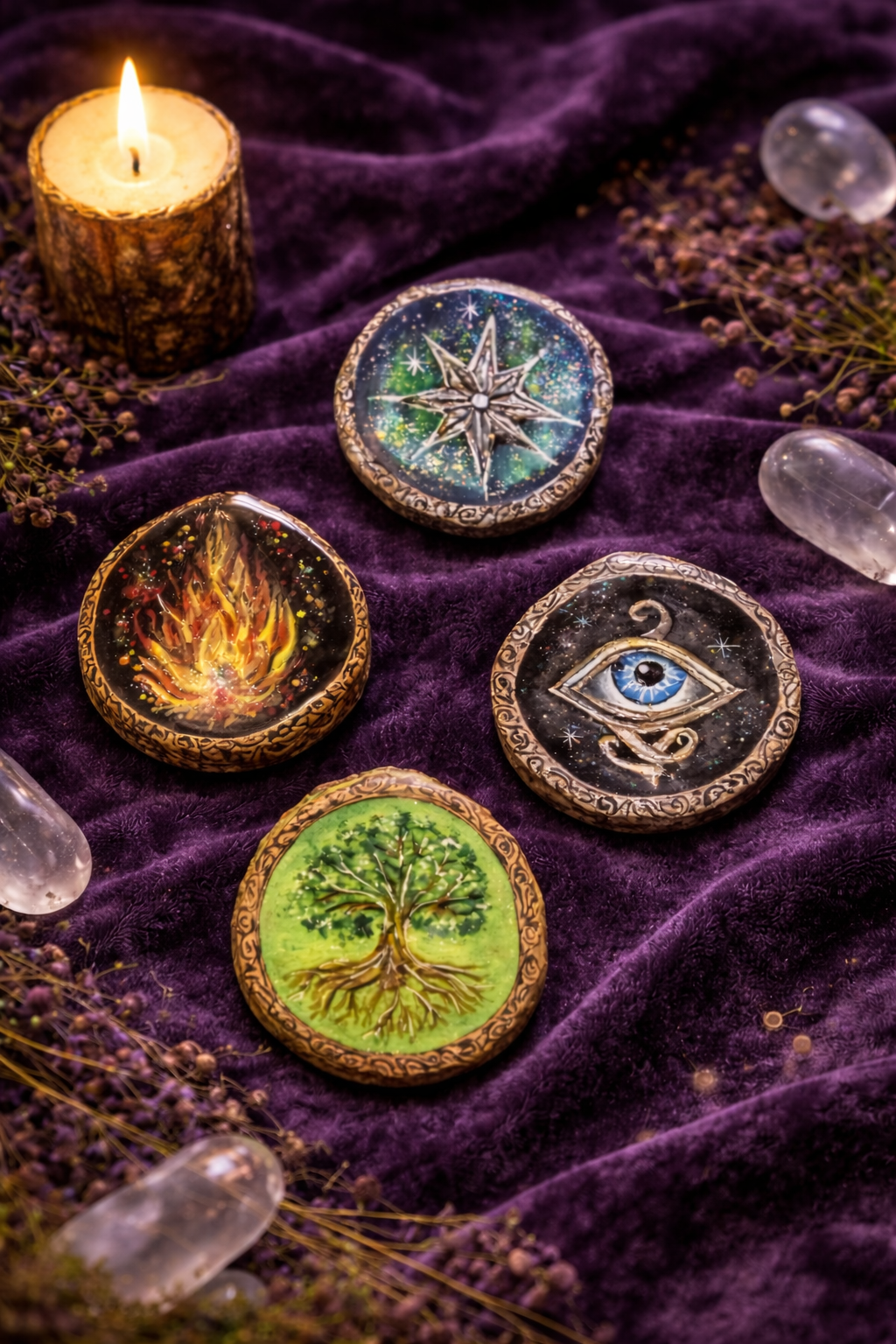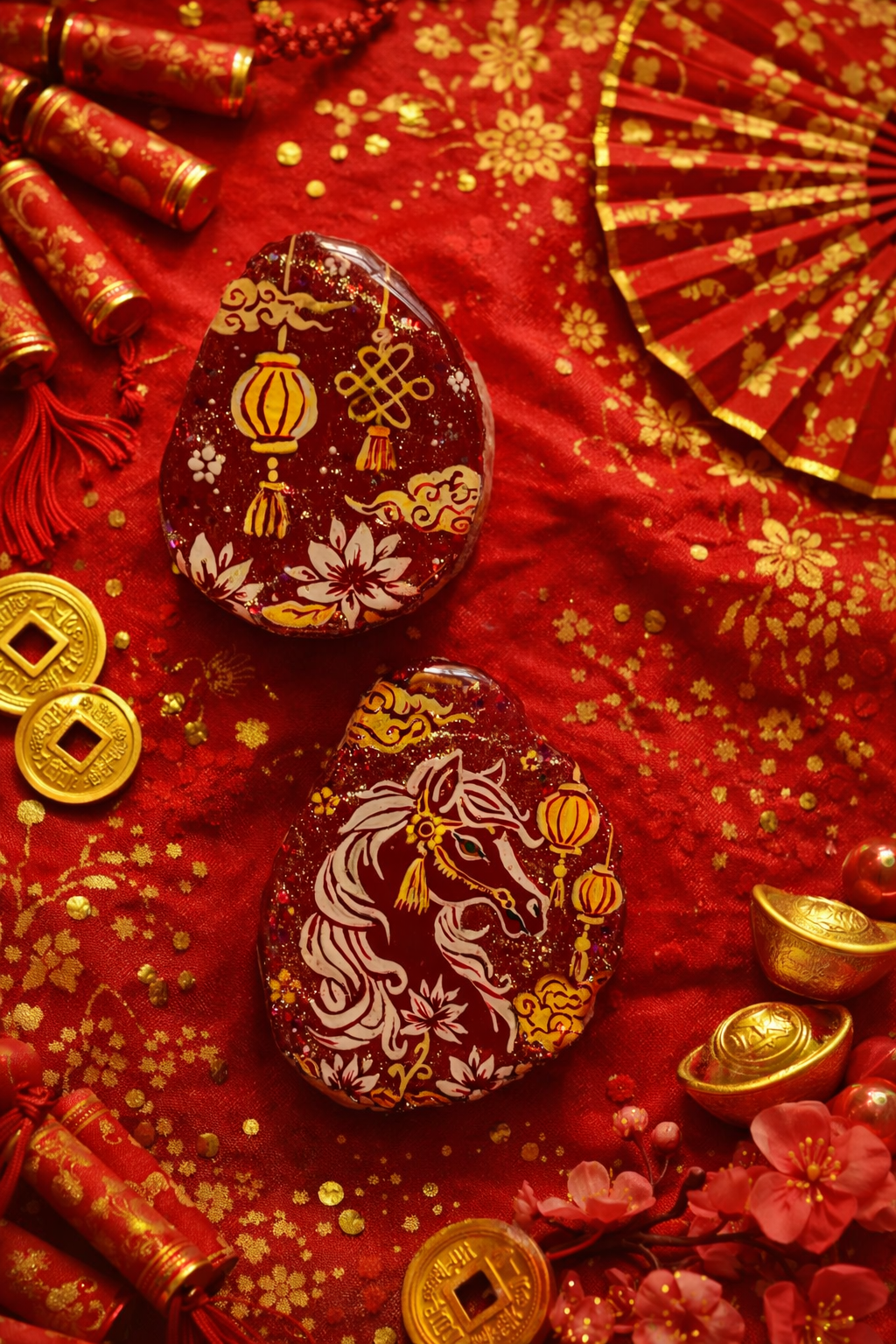 A selection of antler tags with hand-painted designs.